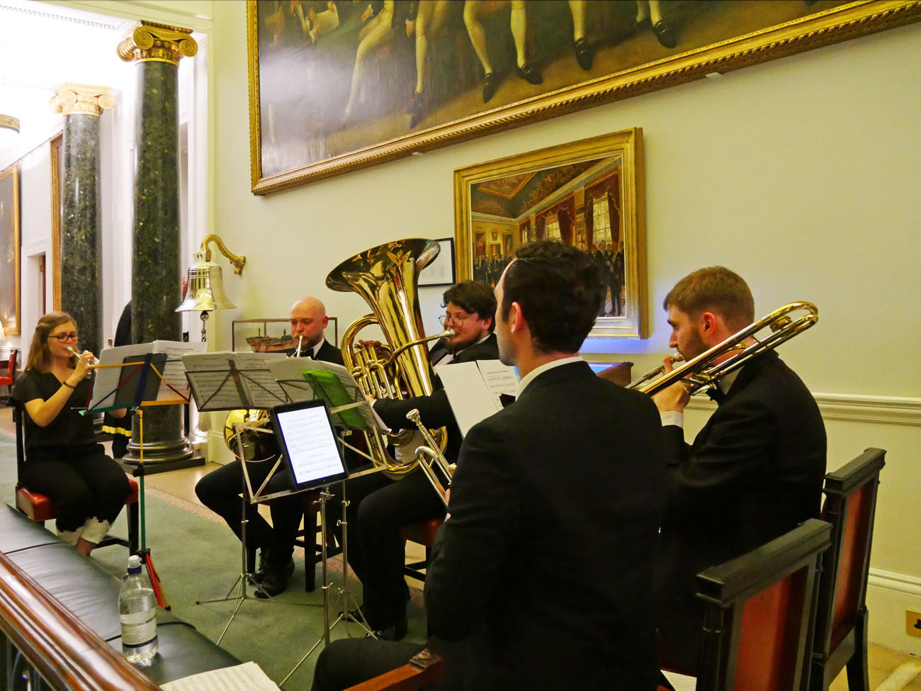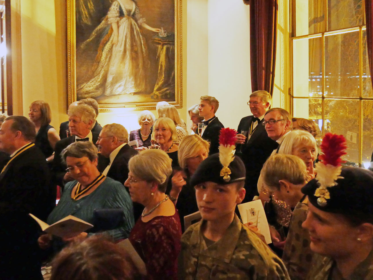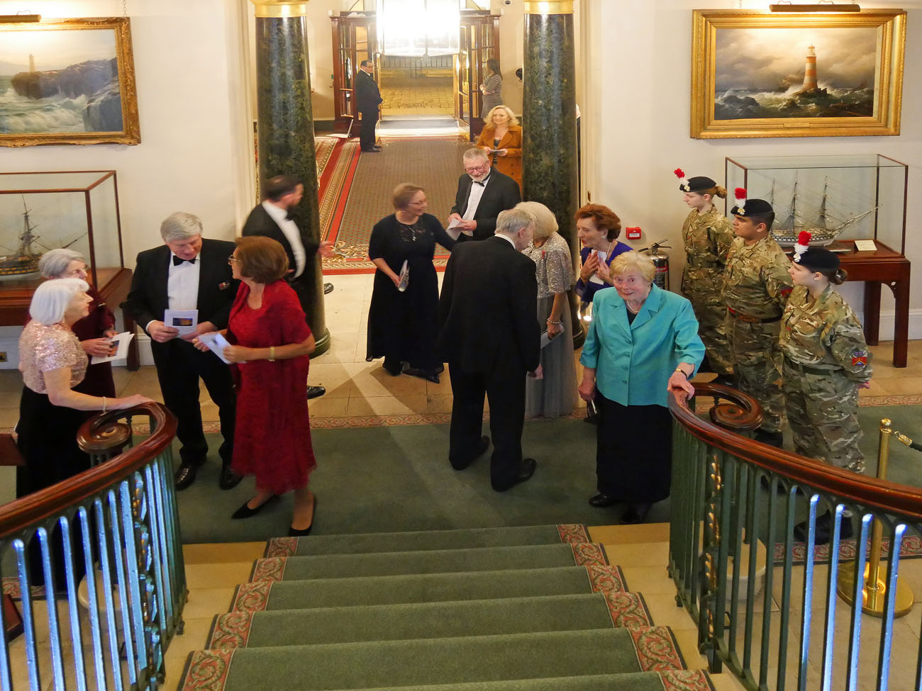 We were warmly welcomed by their headquarters ‘crew’ and by our impeccably turned out cadets of the 1921 Air Cadets Squadron and the 135 Detachment Royal Fusiliers. Trinity House is filled with maritime paintings and artefacts including a contemporary painting of Queen Elizabeth I, Churchill and Roosevelt meeting at sea during World War II, and the ship’s bell from the Royal Yacht Britannia, which were a delight to peruse. Many of their records and possessions were destroyed in the Great Fire of London, another fire in 1715 and an incendiary bomb during the Blitz that destroyed the 1796 building. It was faithfully rebuilt in the same style and reopened in 1953. The reception was held under the magnificently painted ceiling in the Court Room, where Edgar King described the unique history of Trinity House.