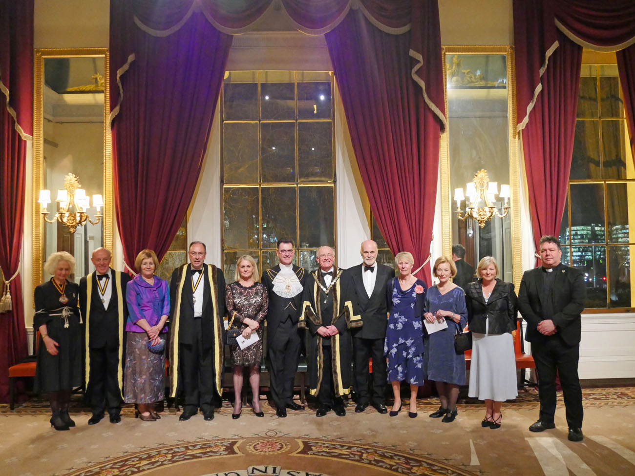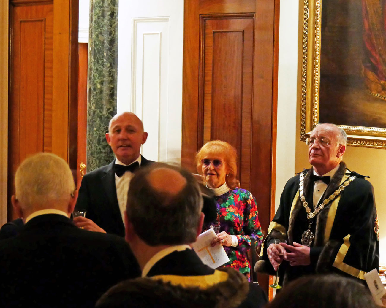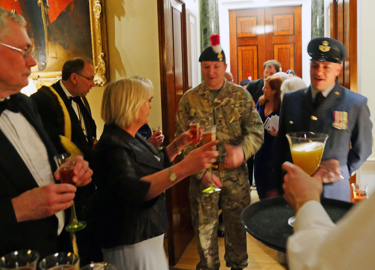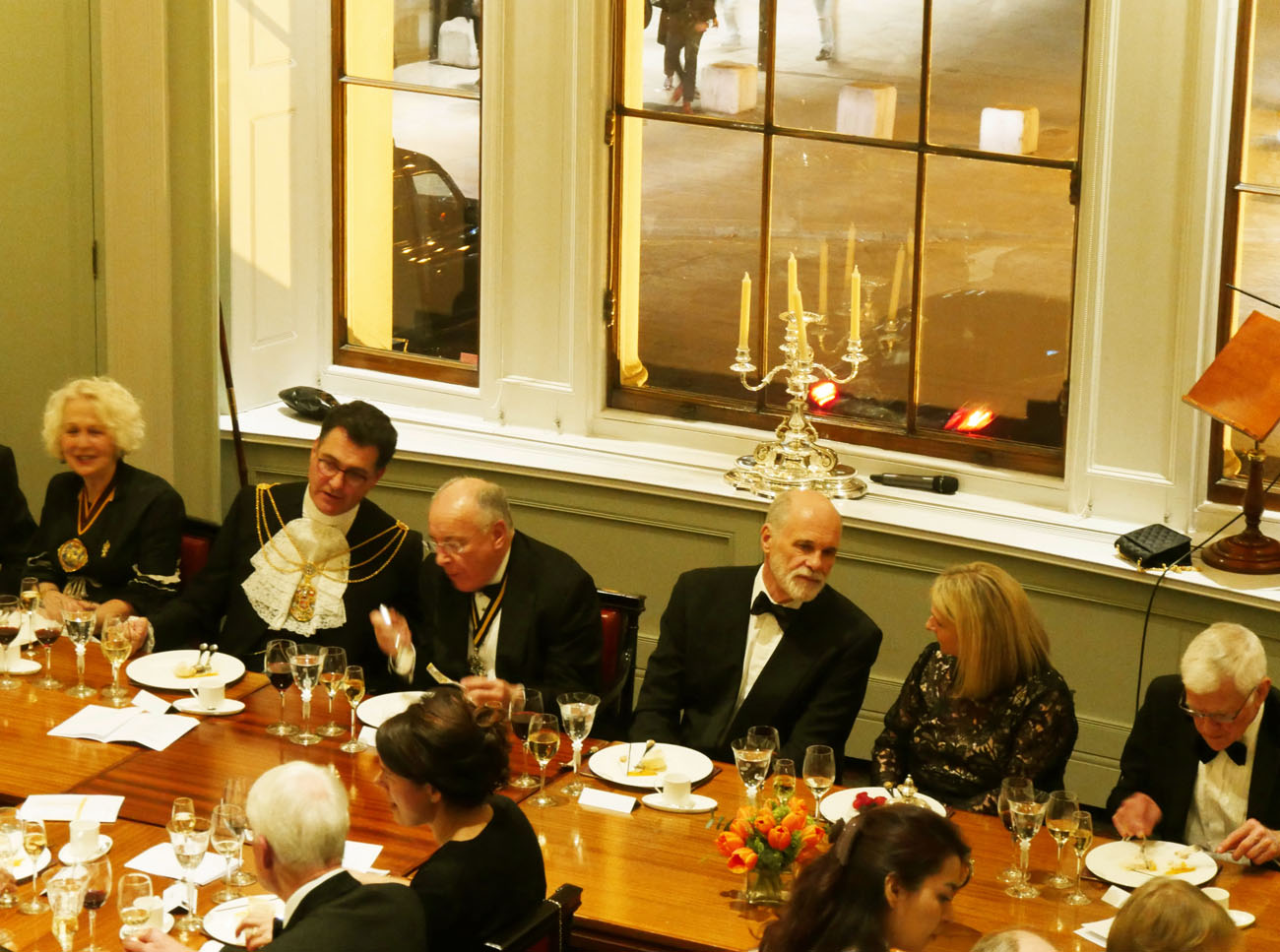 We moved through to another elegant room, called the Library, to dine beneath the minstrels’ gallery where the Elysium Brass, a quintet of graduates from the Guildhall School of Music and Drama, performed for us at intervals throughout the evening. Unexpectedly we were served the red wine first, a Gamay from Anjou, which went well with the starter of Mozzarella and smoked venison salad. Picpoul from Languedoc followed providing a delicate accompaniment to the main course of Arctic Char. Loving cups circulated followed by the traditional toasts. Duncan Garland, the Upper Warden, welcomed the guests. David Rintoul, the Scottish actor, described some amusing experiences in his versatile career in theatre, film, television and audiobook recording. The Master responded and presented a cheque from the Fletchers to Alderman and Sheriff Vincent Keaveney for the Lord Mayor’s Appeal. The Sheriff replied and gave the toast to the Worshipful Company of Fletchers coupled with the name of the Master.