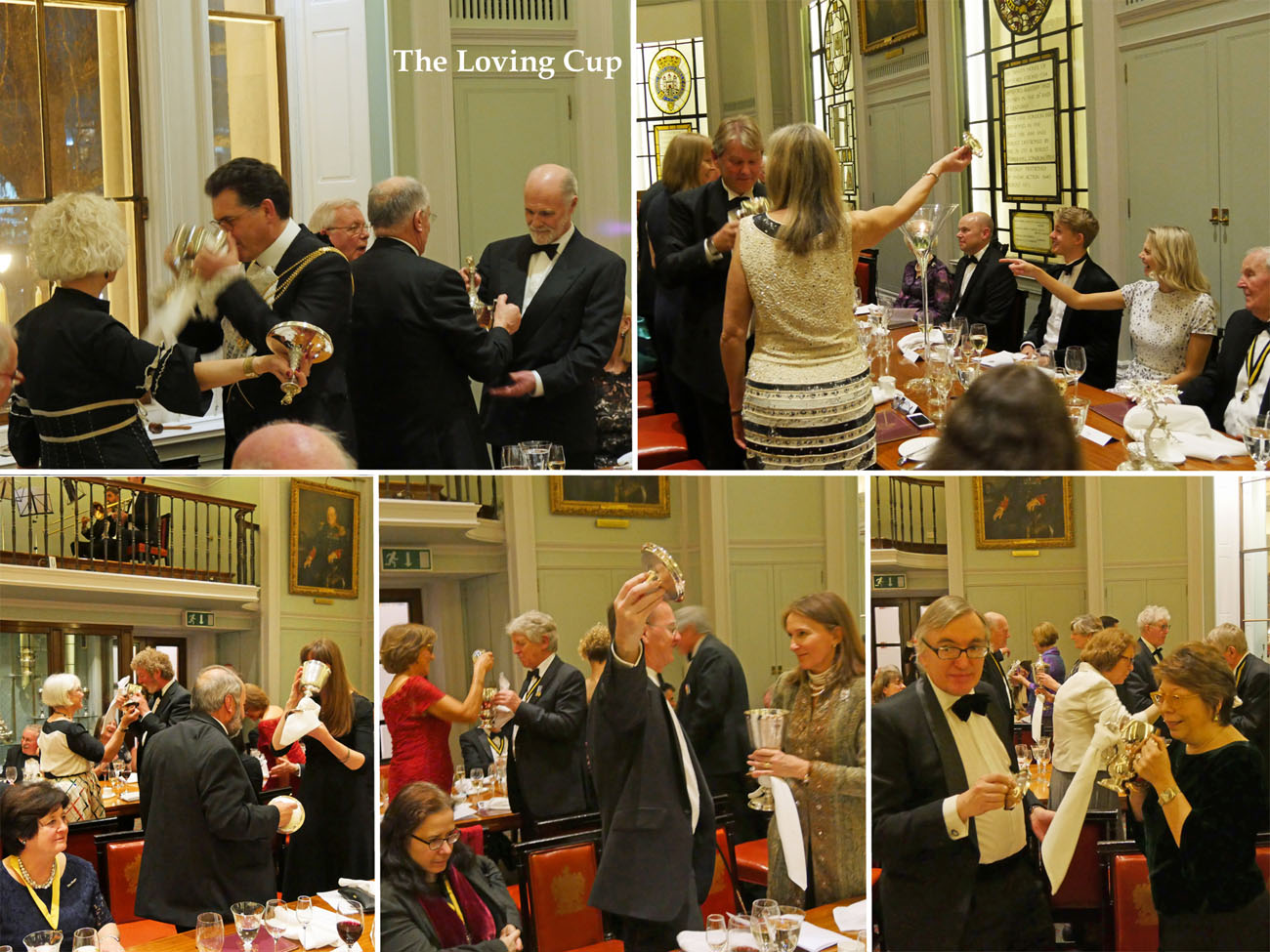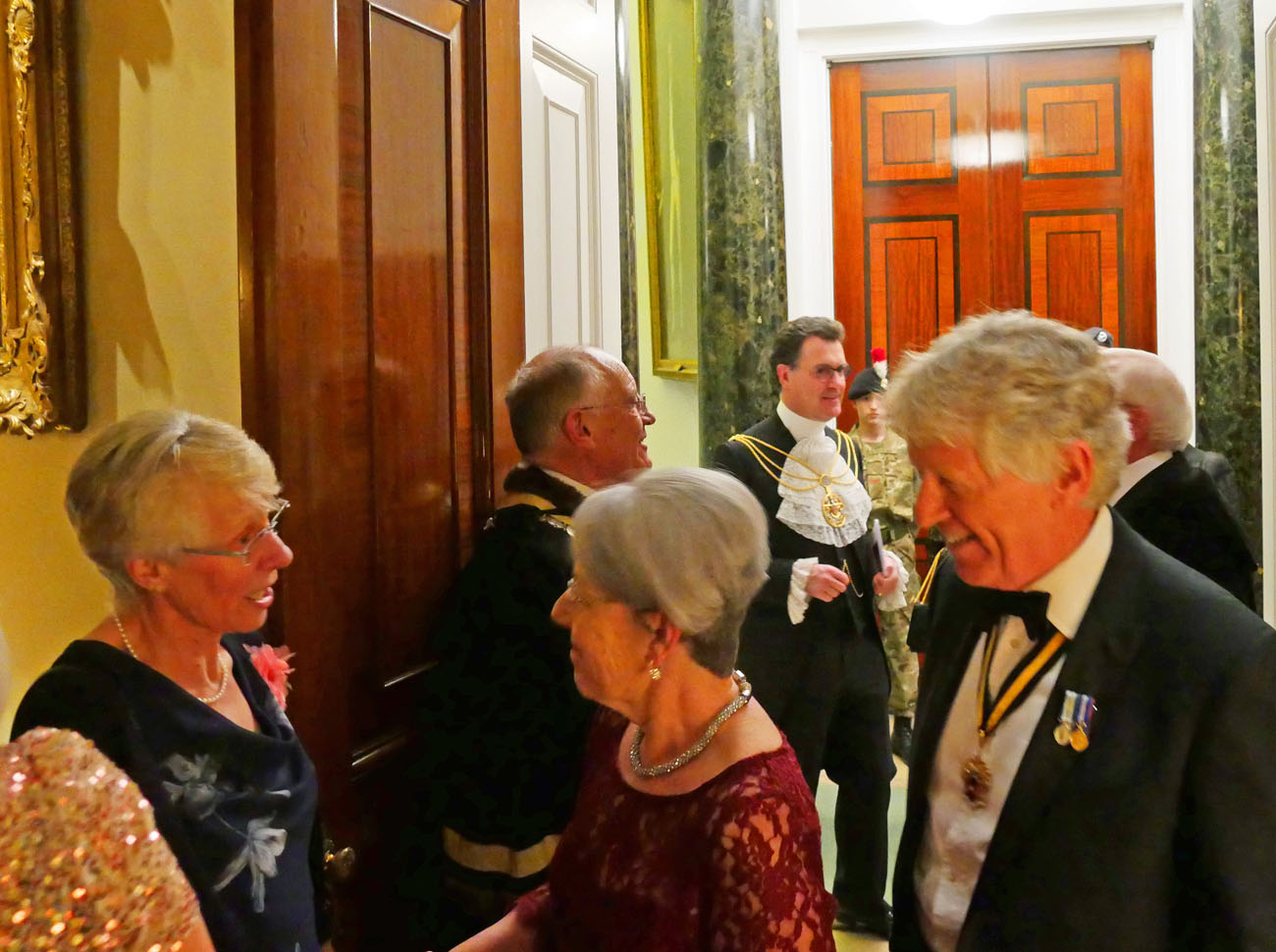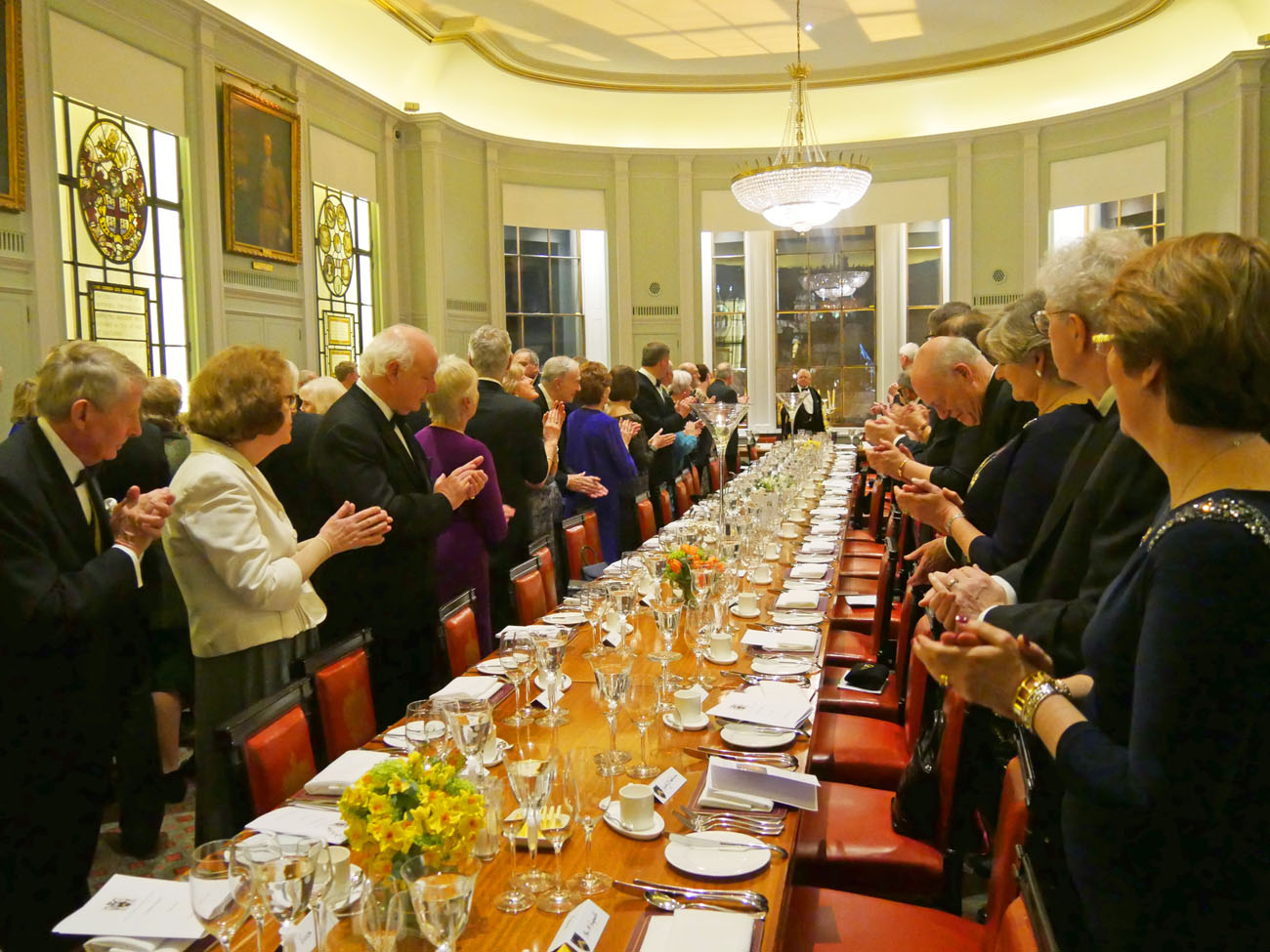 We moved through to another elegant room, called the Library, to dine beneath the minstrels’ gallery where the Elysium Brass, a quintet of graduates from the Guildhall School of Music and Drama, performed for us at intervals throughout the evening. Unexpectedly we were served the red wine first, a Gamay from Anjou, which went well with the starter of Mozzarella and smoked venison salad. Picpoul from Languedoc followed providing a delicate accompaniment to the main course of Arctic Char. Loving cups circulated followed by the traditional toasts. Duncan Garland, the Upper Warden, welcomed the guests. David Rintoul, the Scottish actor, described some amusing experiences in his versatile career in theatre, film, television and audiobook recording. The Master responded and presented a cheque from the Fletchers to Alderman and Sheriff Vincent Keaveney for the Lord Mayor’s Appeal. The Sheriff replied and gave the toast to the Worshipful Company of Fletchers coupled with the name of the Master.