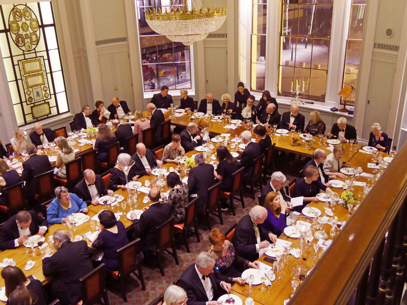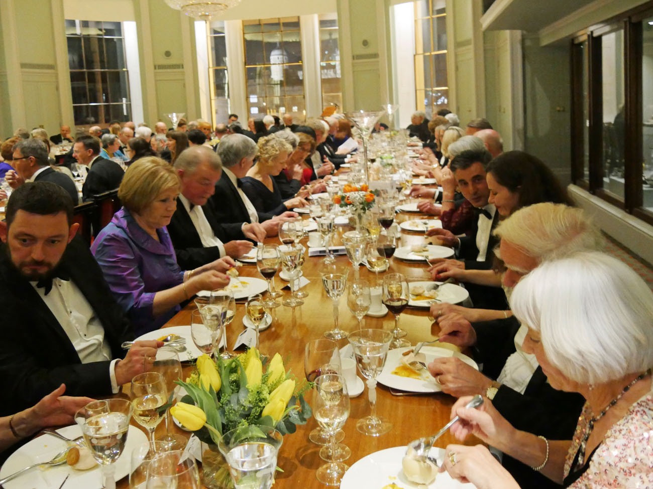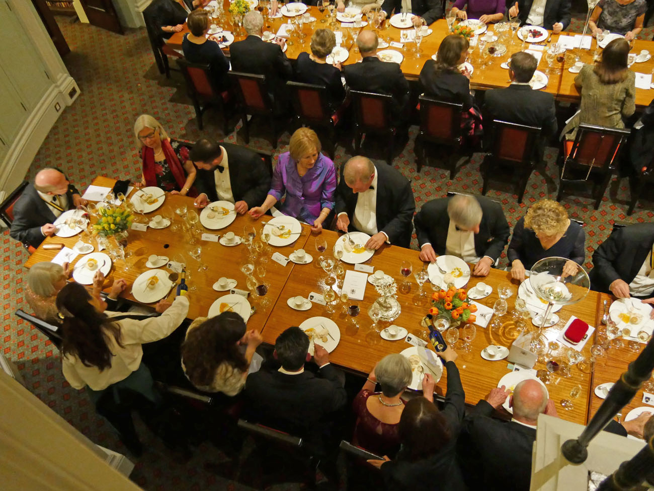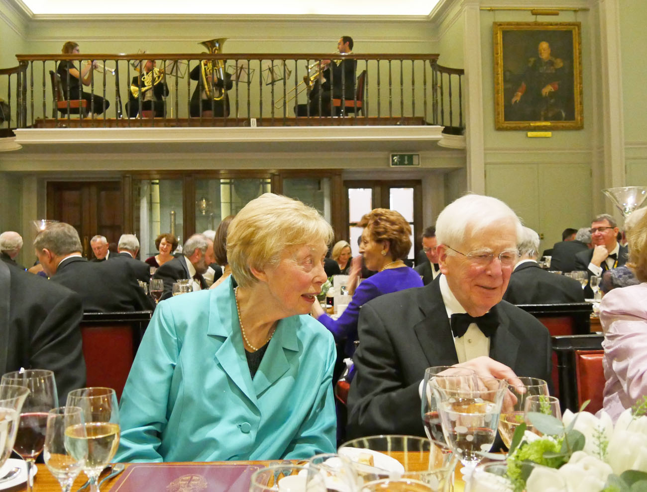 We moved through to another elegant room, called the Library, to dine beneath the minstrels’ gallery where the Elysium Brass, a quintet of graduates from the Guildhall School of Music and Drama, performed for us at intervals throughout the evening. Unexpectedly we were served the red wine first, a Gamay from Anjou, which went well with the starter of Mozzarella and smoked venison salad. Picpoul from Languedoc followed providing a delicate accompaniment to the main course of Arctic Char. Loving cups circulated followed by the traditional toasts. Duncan Garland, the Upper Warden, welcomed the guests. David Rintoul, the Scottish actor, described some amusing experiences in his versatile career in theatre, film, television and audiobook recording. The Master responded and presented a cheque from the Fletchers to Alderman and Sheriff Vincent Keaveney for the Lord Mayor’s Appeal. The Sheriff replied and gave the toast to the Worshipful Company of Fletchers coupled with the name of the Master.