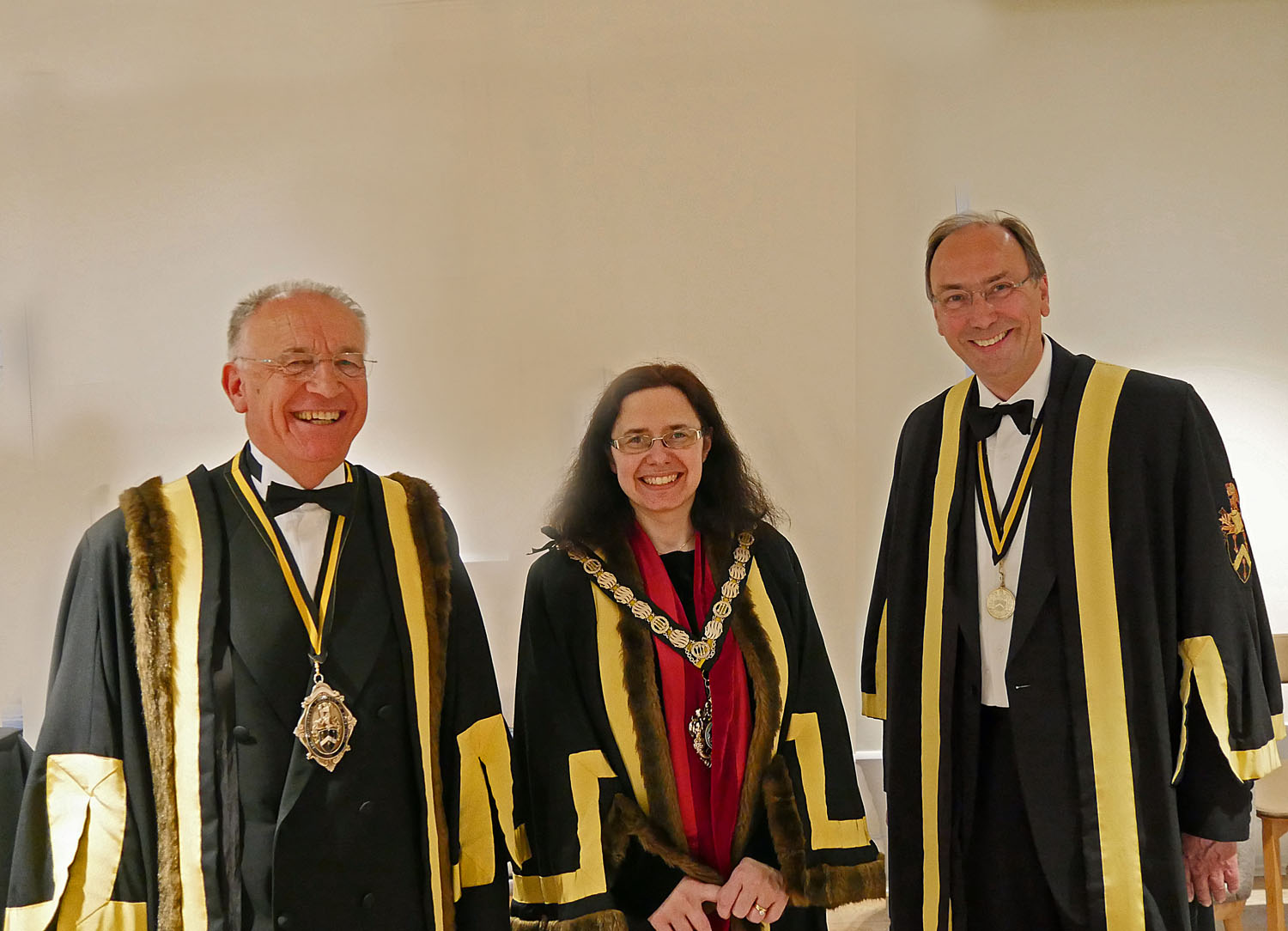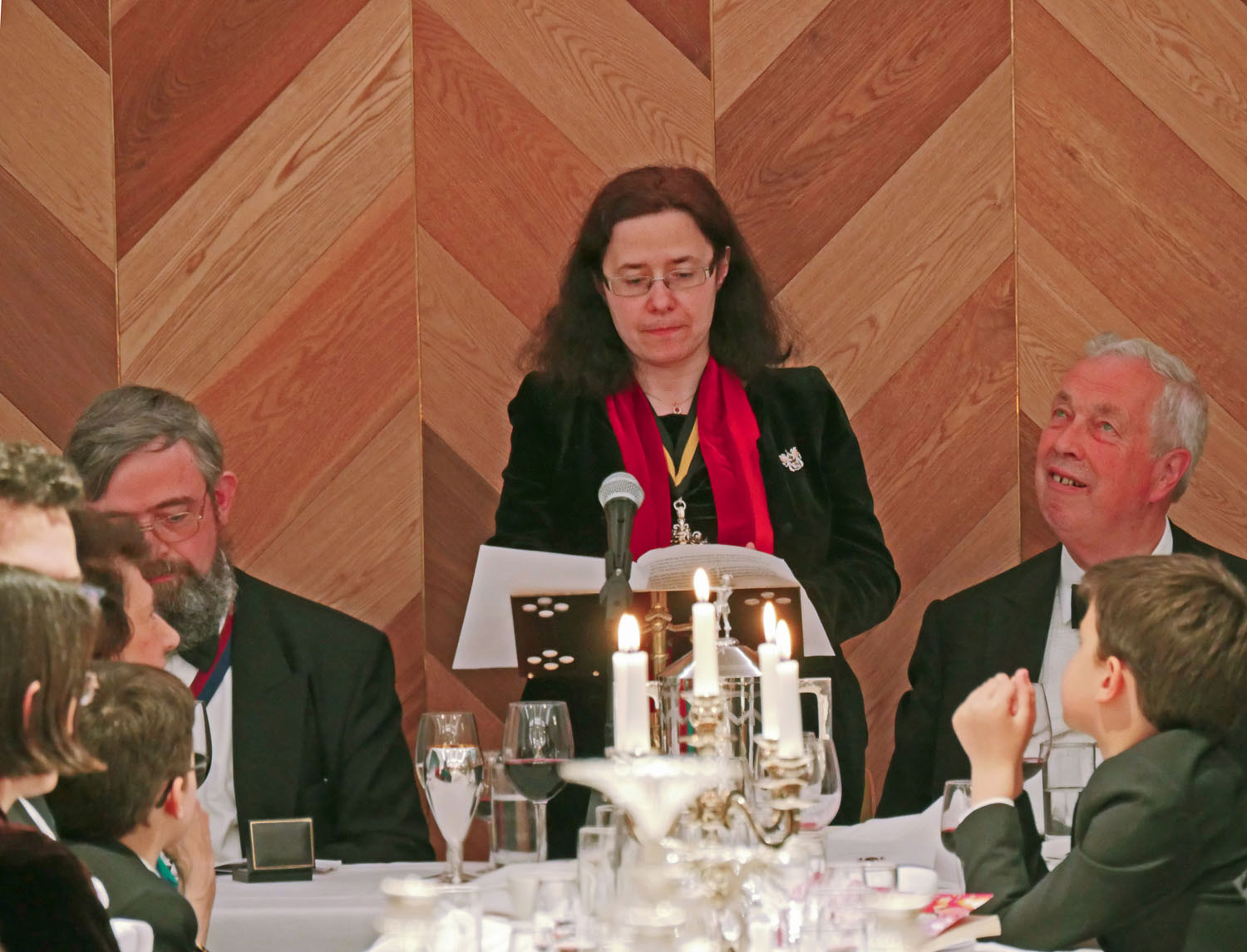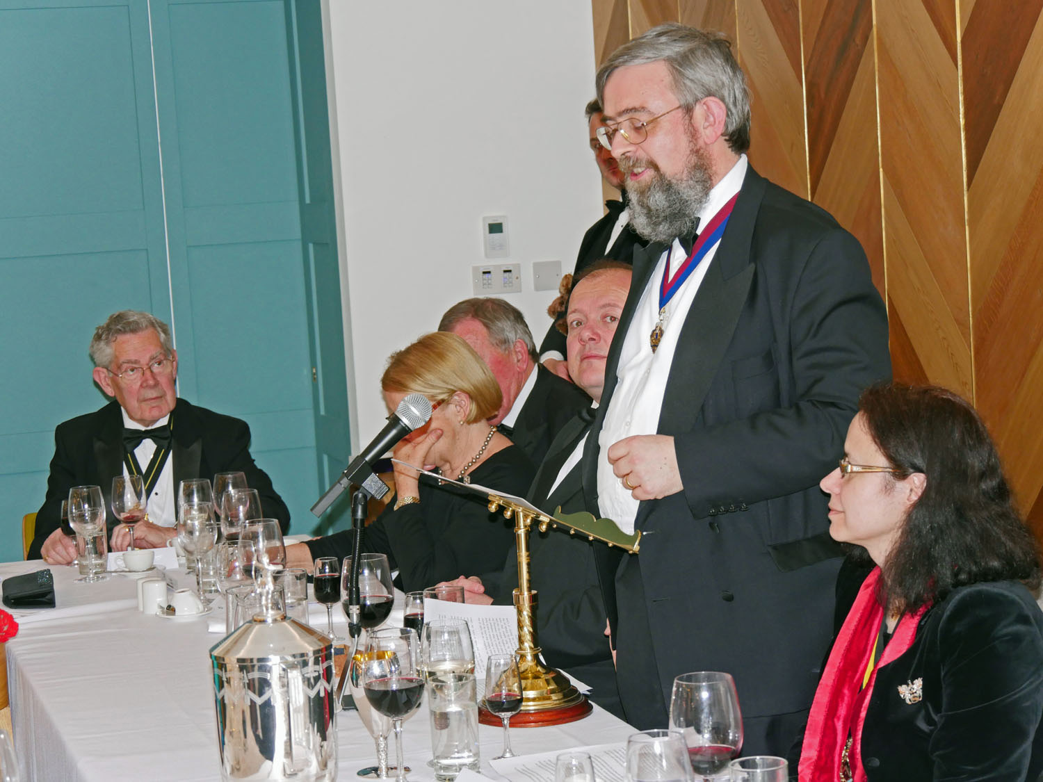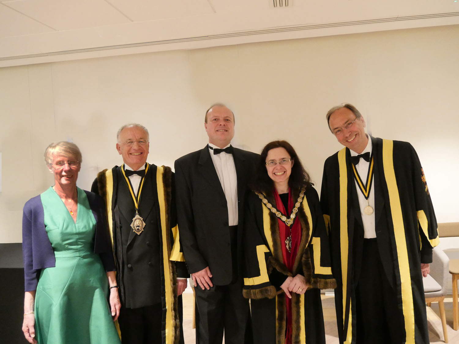 The Beadle then asked for silence to hear the Master’s response. The Master started by repeating the welcome to all the guests, especially her family and thanked them for all their support. She also thanked everyone for electing her and providing help and in particular, Stuart Fraser the outgoing Master, to whom she presented his Past Master’s badge. Clare concluded by inviting every-one to join her and the Wardens upstairs for a stirrup cup. She sat down to great applause.