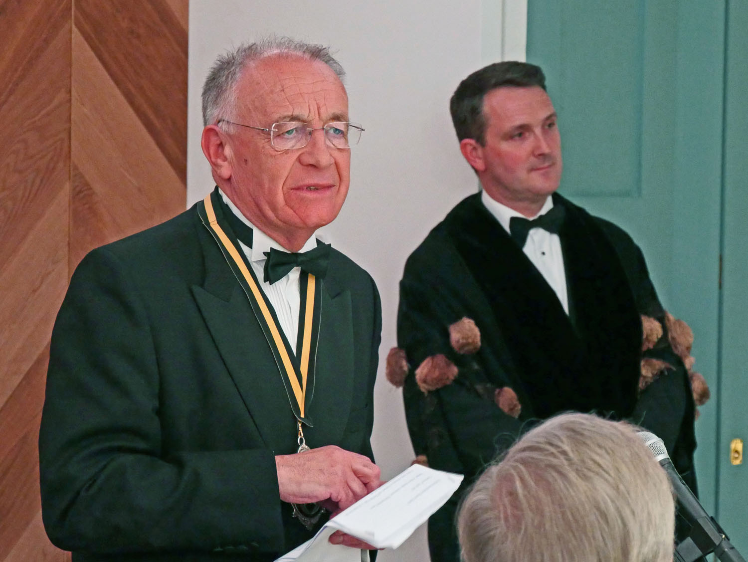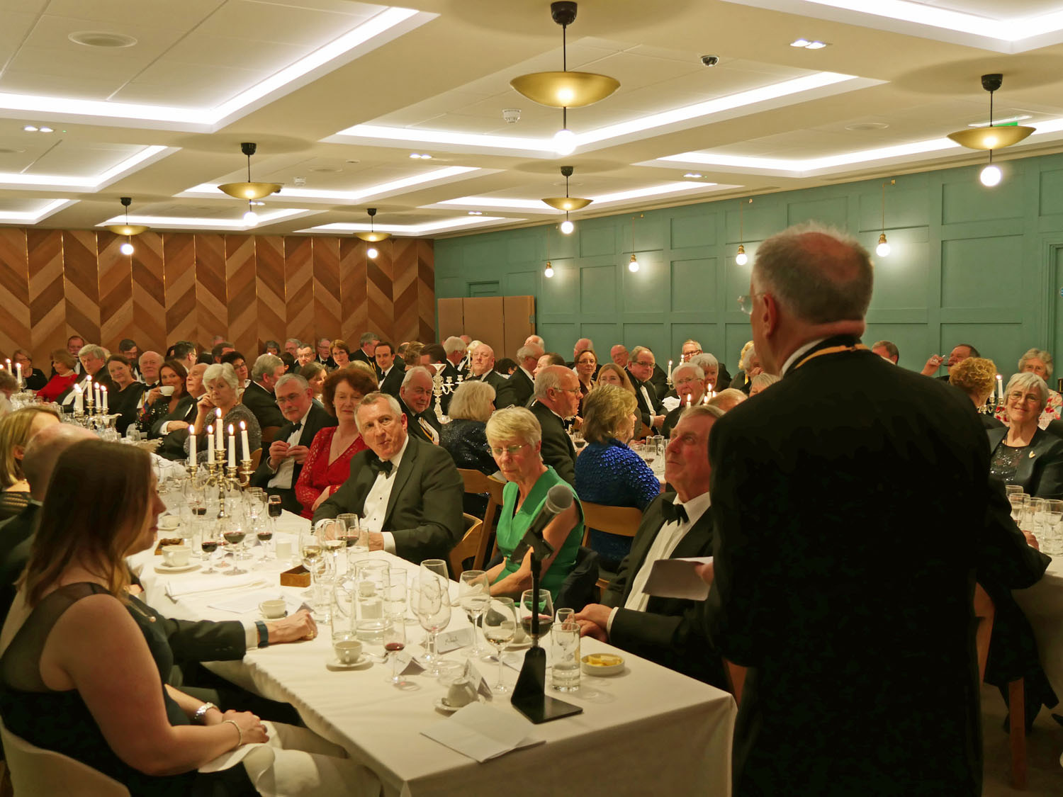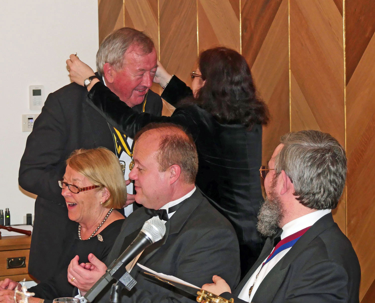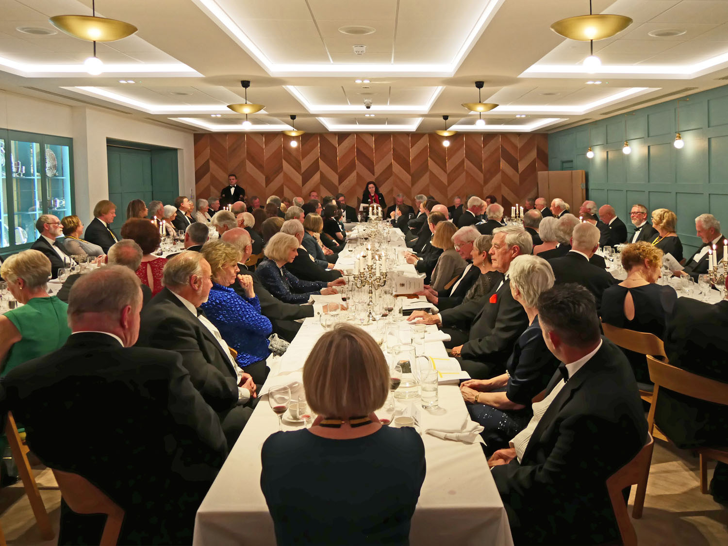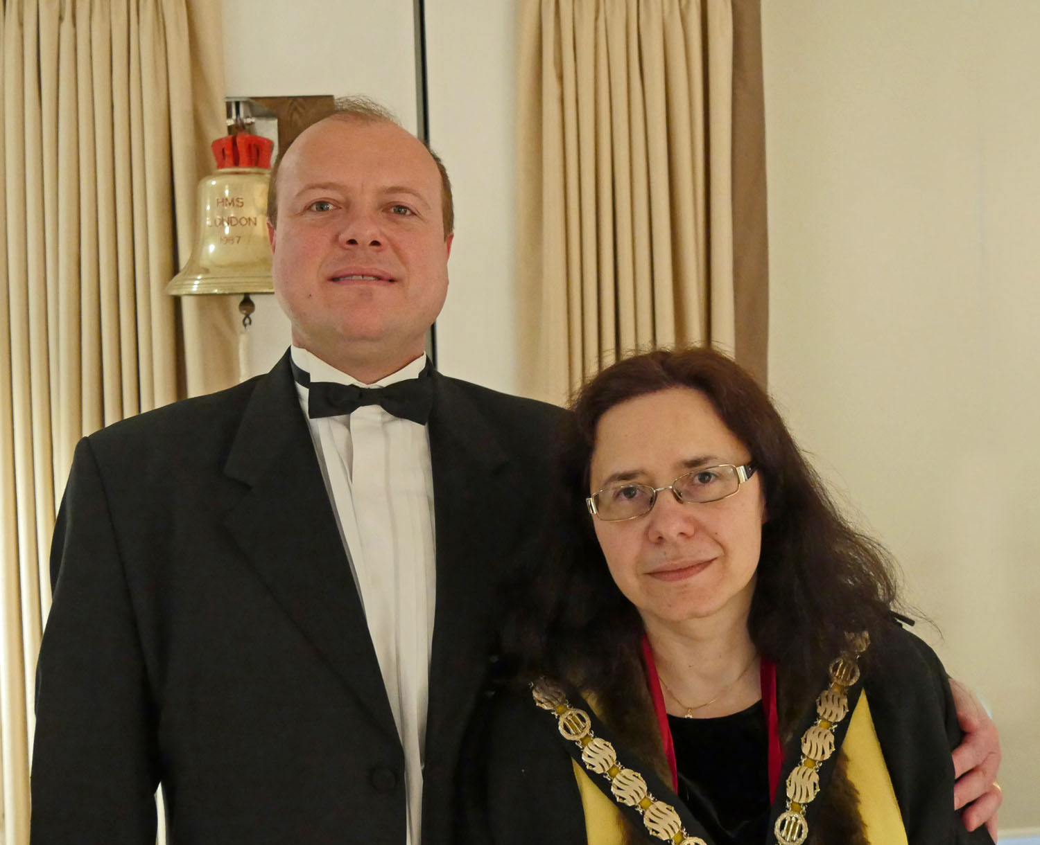 The Beadle then asked for silence to hear the Master’s response. The Master started by repeating the welcome to all the guests, especially her family and thanked them for all their support. She also thanked everyone for electing her and providing help and in particular, Stuart Fraser the outgoing Master, to whom she presented his Past Master’s badge. Clare concluded by inviting every-one to join her and the Wardens upstairs for a stirrup cup. She sat down to great applause.