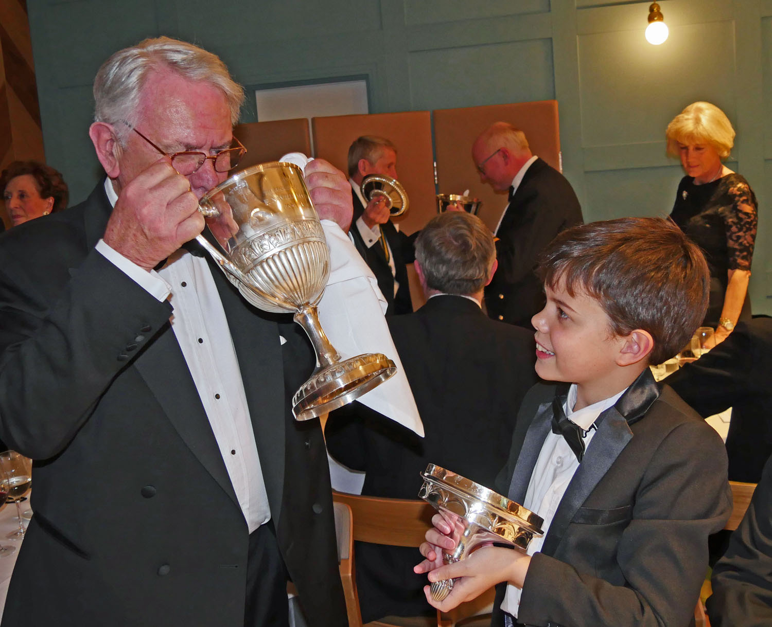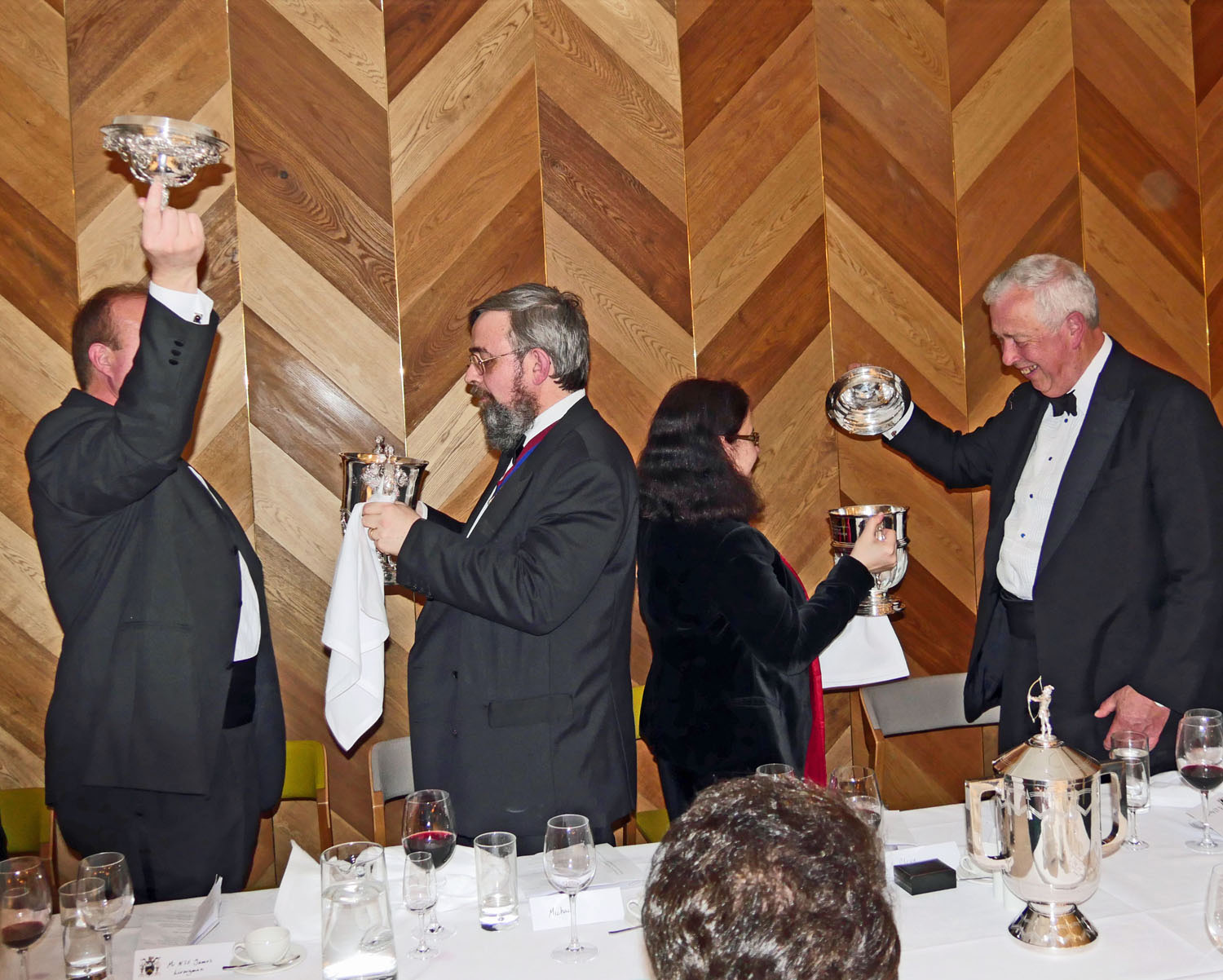 The dinner that followed her taking up the chair at Court was excellent. An Escalope of Cod, followed by a Slow Cooked Rump of West Country Lamb, with a chocolate medley for dessert. After the customary toasts, the Master and Wardens invited us all to take part in a “Loving Cup”. A series of cups were produced for each of the table sprigs and the cups passed round in the usual manner – there appeared to be a wager on which sprig would finish first!!