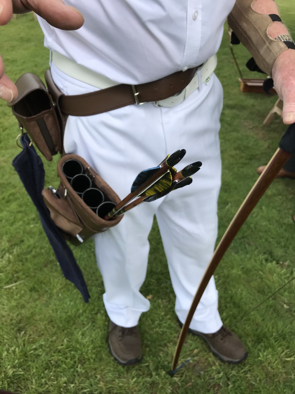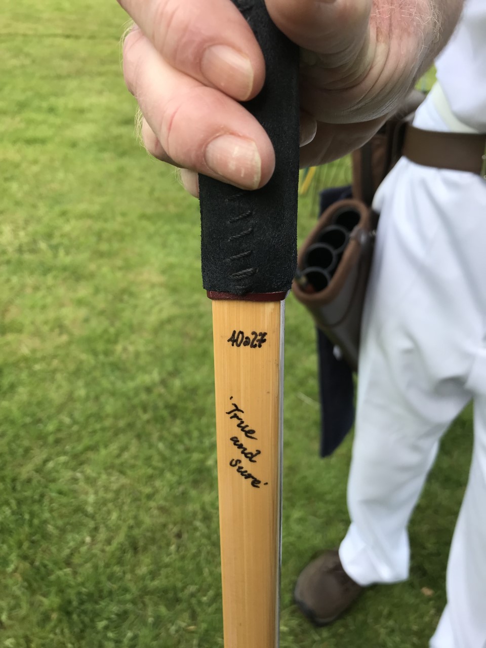 Gordon's longbow is inscribed with the motto of the Company, and his arrow fletchings are in the Company colours of black and yellow.